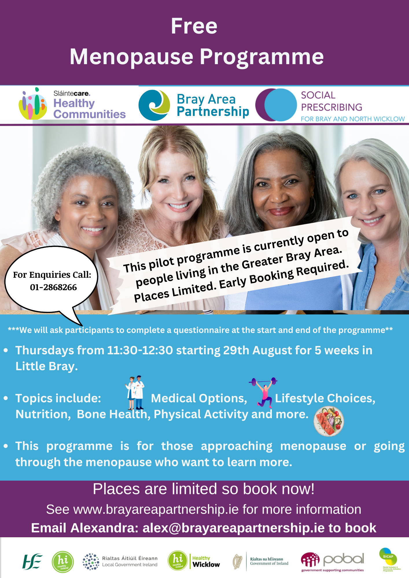 Our Social Prescribing for Bray and North Wicklow team are running a free Free Menopause programme starting Thursday the 29th August  from 11.30 to 12.30 August for 6 weeks.